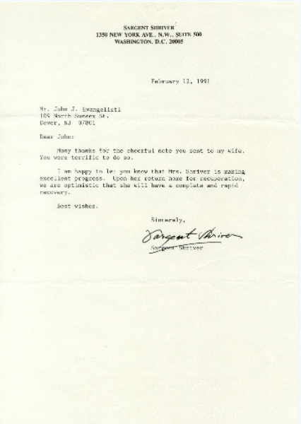 nice signed letter re: Eunice Kennedy Shriver's health; authentic signature; comes with original mailing envelope