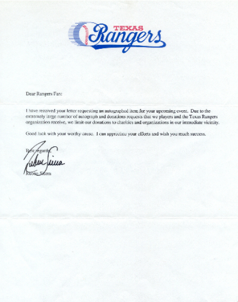 Signed Letter of Texas Rangers letterhead; authentic signature
