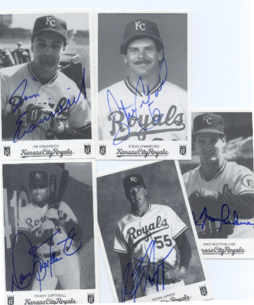 Danny Tartabull, Jim Eisenreich, Steve Crawford.Kevin Appier, and Mike Macfarlane 3 x 5 cards; signatures are authentic; comes with a secretarial transmittal on Kansas City Royals letterhead