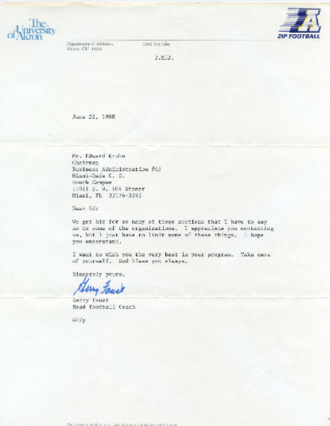 nice letter; authentic signature on Akron Zips letterhead