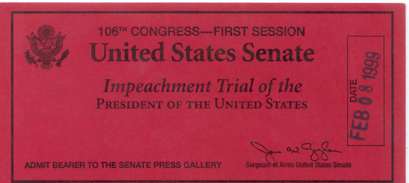 Ticket to the Senate Gallery for the Impeachment Trial of William Clintonm February 8, 1999; Trial was note held and most tickets were destroyed. These tickets are seldom found. Excellent condition.
