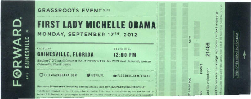 Unused ticket for FIrst Lady Michelle Obama campaign event in Gainesville, Florida; excellent condition