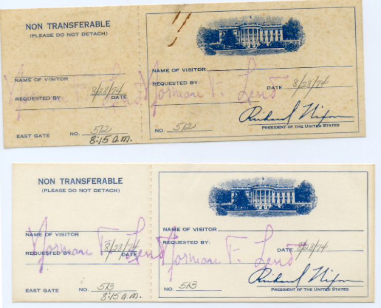 two tickets to tour the White House in 1974. toning and paper clip stain